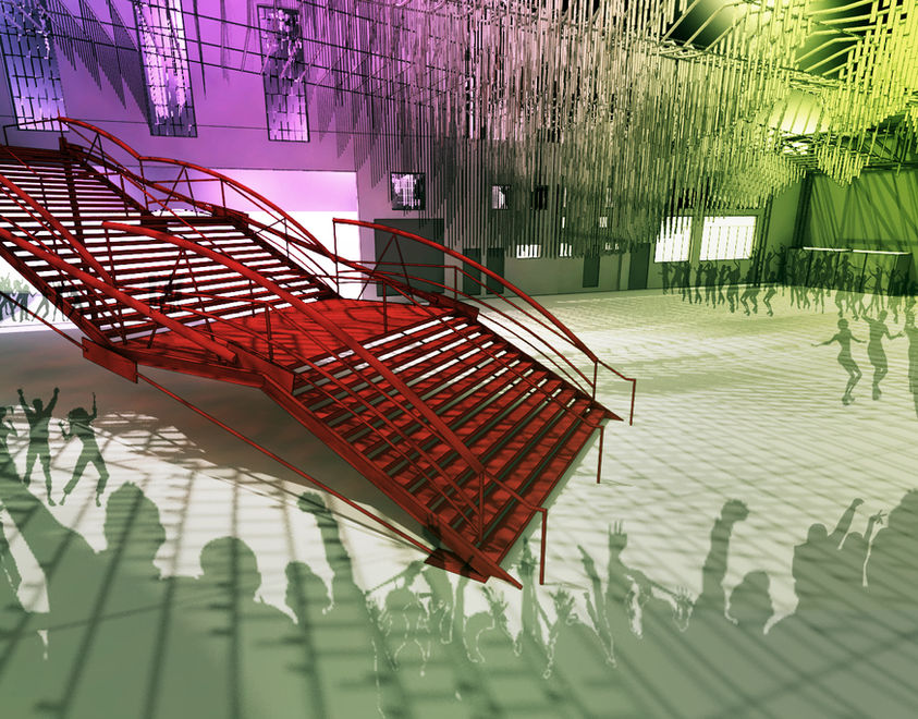 The project consists of a hanging mantle, which emerges from a mapping of the place according to two variable conditions: The internal fronts of the Konex Cultural City, where special care is taken and the aim is to anchor in those places that present a royal path to allow continuity in the development of the cultural activities of the center. And circulations that emerge from the magnificent sculptural staircase designed by Clorindo Testa and unfold to the different sectors of the courtyard. These circulations determine how much and when the hanging mantle rises or falls on the zero plane without ever reaching it, allowing to place remains appropriate with different cultural activities like recitals, installations, events, exhibitions.
